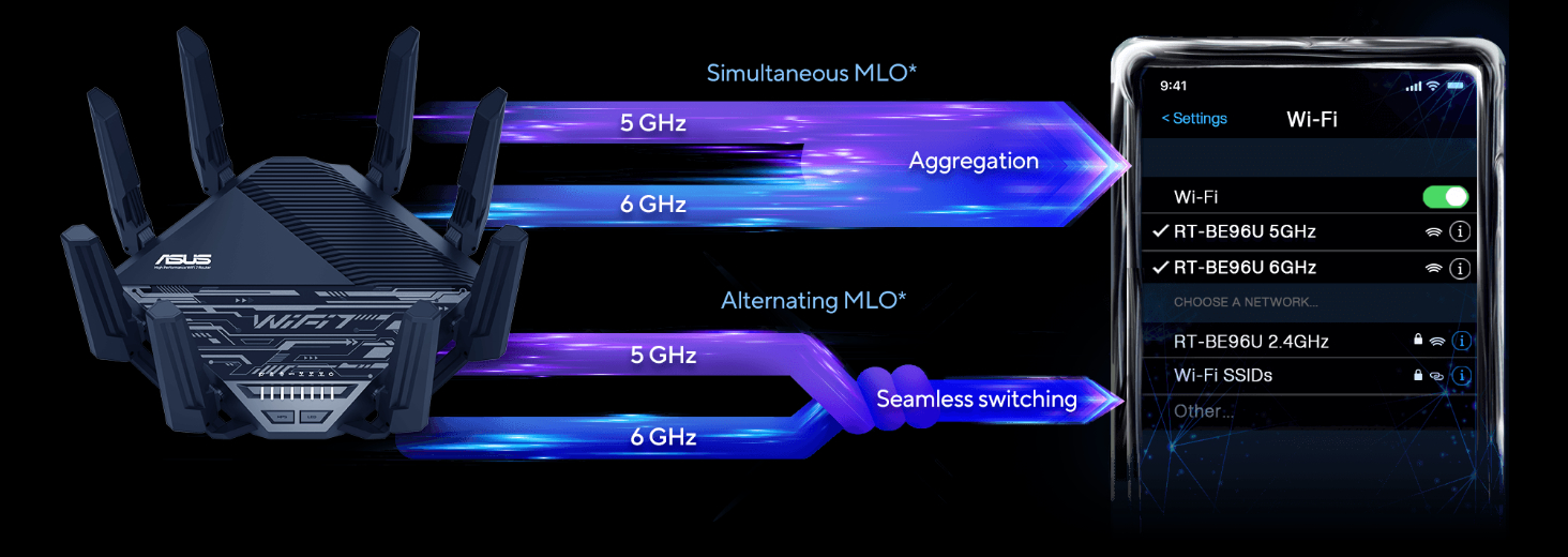 RT-BE96U sending out one 5GHz band and one 6GHz band, two bands aggregates with simultaneous MLO technology for larger bandwidth, while 5GHz band and 6GHz combing into one with alternating MLO technology for seamless switch. Two bands received by smart phone, smart phone is connected to 5GHz and 6GHz band simultaneously.