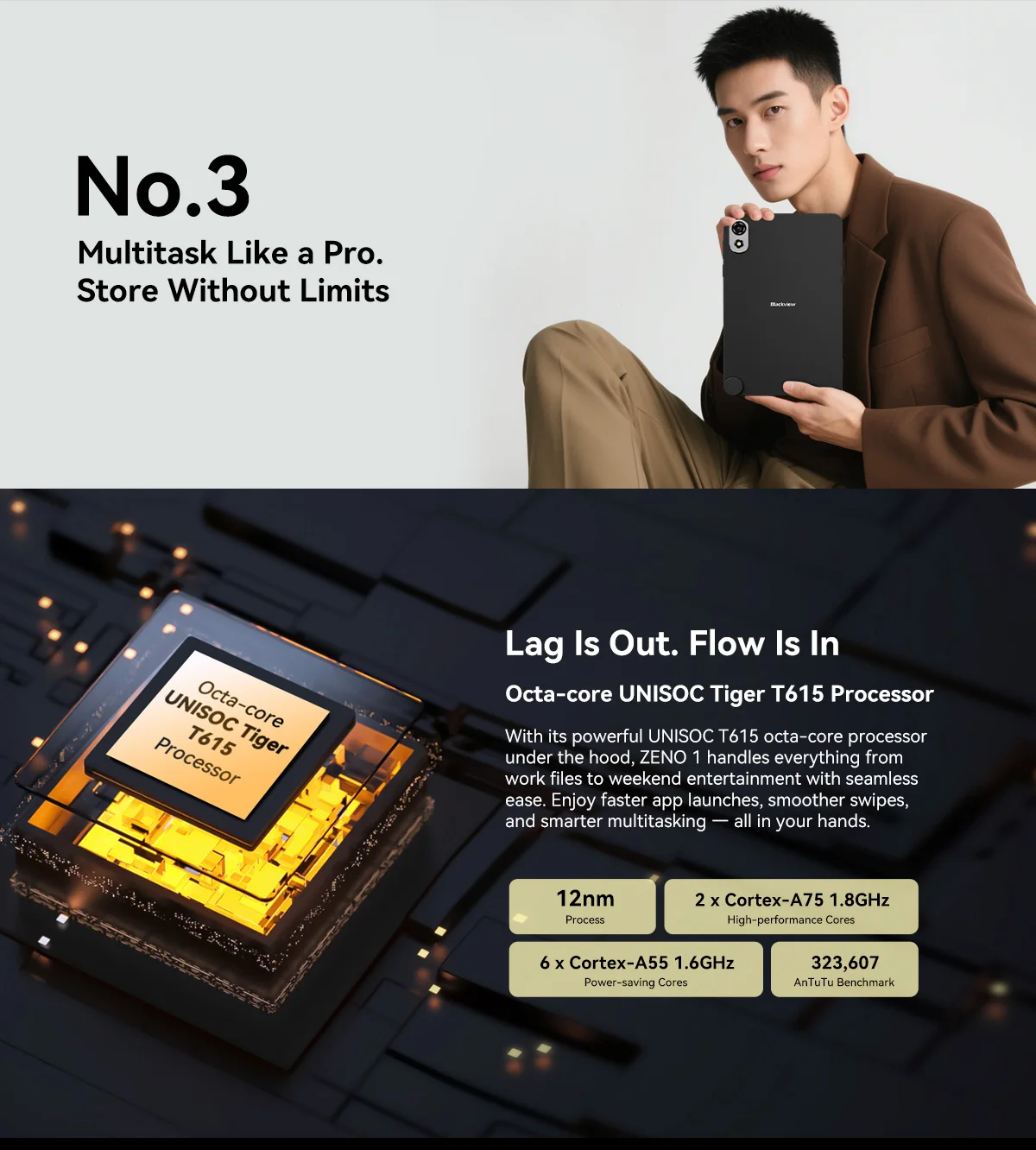 5. CPU: Unisoc Tiger T615 Octa Core (2 x A75 1.8GHz + 6 x A55 1.6GHz)