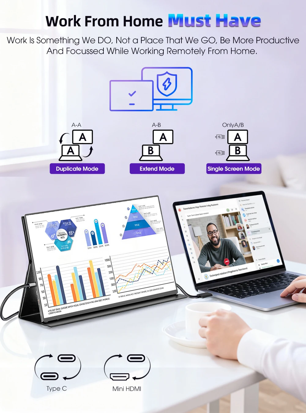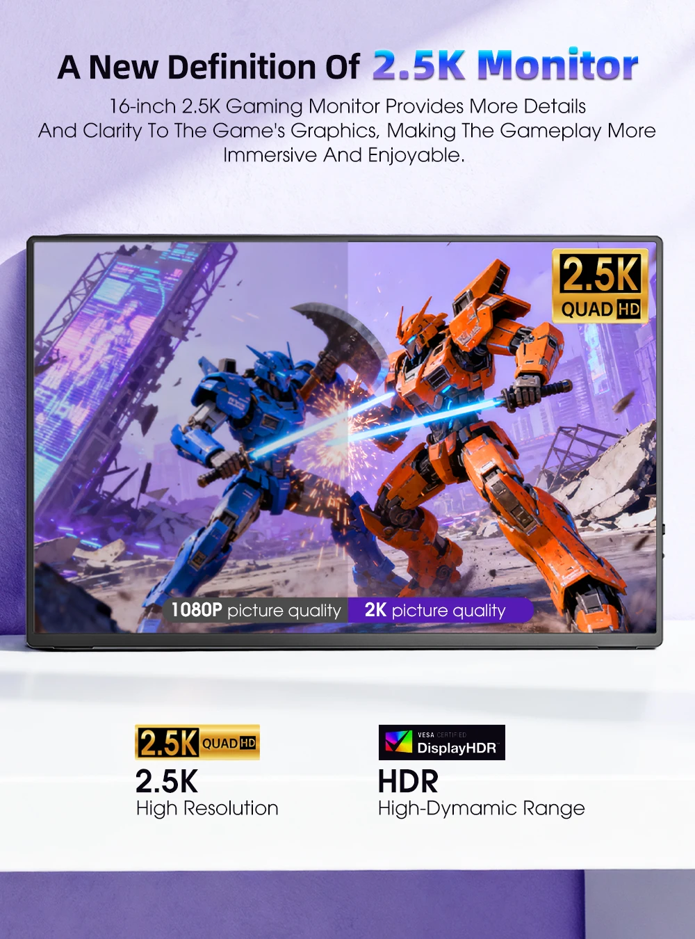 【16 Inch Ultra HD 2K Portable Monitor 】2560*1600 high resolution and HDR support, Compared to 1080P, the colors displayed by 2K monitors are more saturated and realistic. They feature an eye-friendly anti-glare IPS LCD panel that reduces eye strain even after prolonged use.