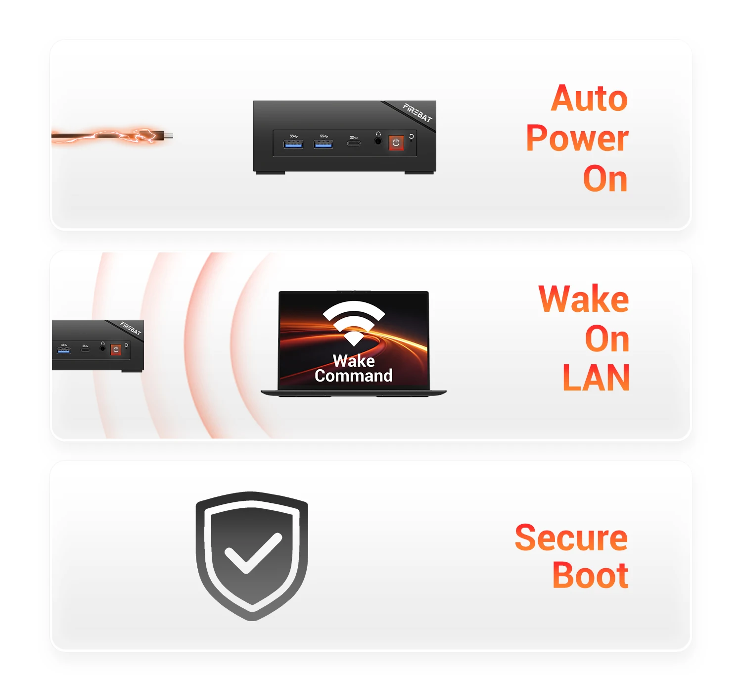 --Additionally, more functions can be modified in the BIOS: automatic power-on after a power failure, wake-on-LAN functionality, and secure boot to counter malware.