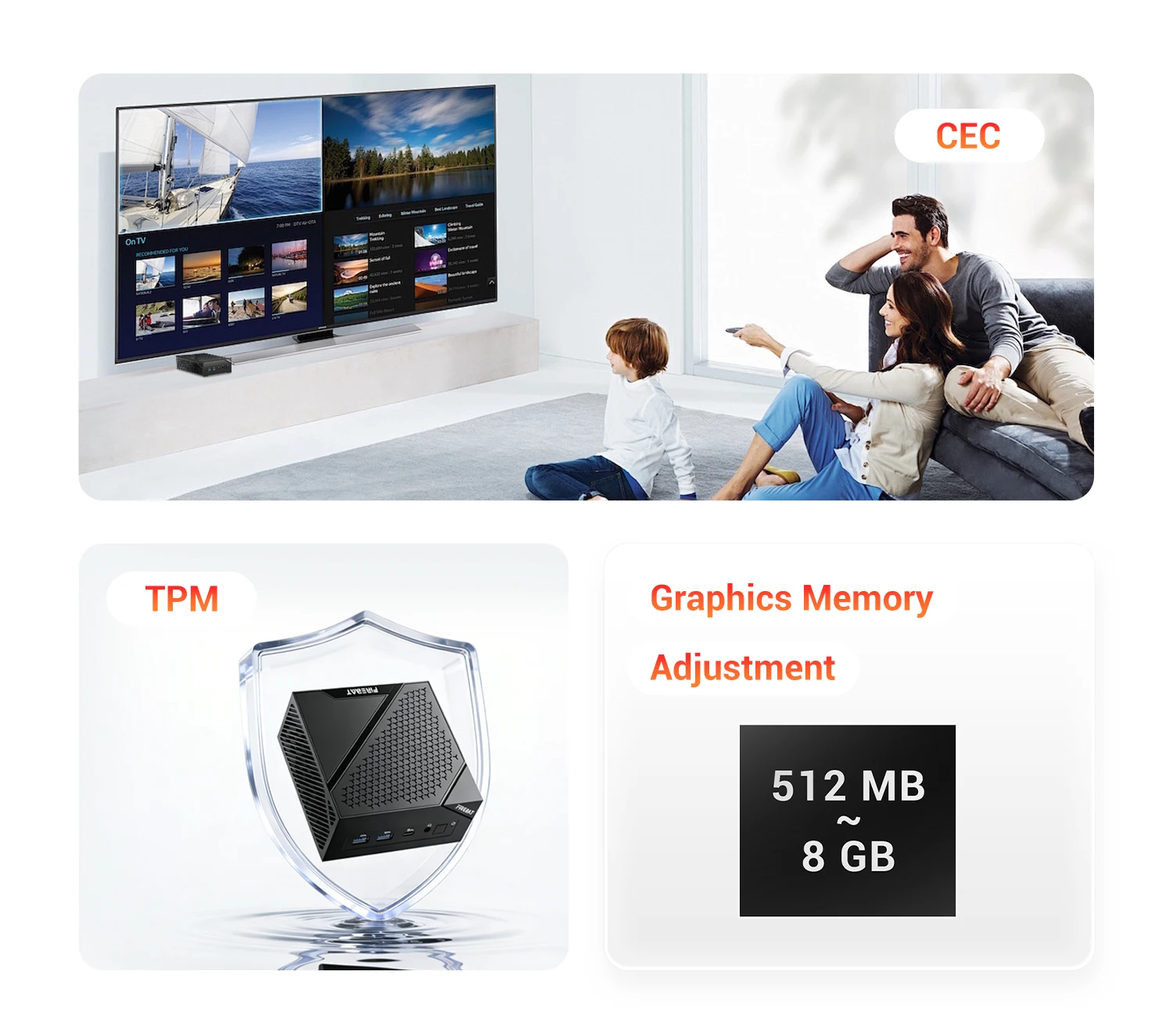 --Combining the high performance of the 6600H with its integrated CEC functionality, you can wake our mini PC simultaneously while powering on your TV using the remote control. We've also equipped the motherboard with a hardware security encryption chip, TPM, delivering hardware-level security protection. This chip generates and stores encryption keys, verifies system integrity, and safeguards sensitive data. Of course, you can also adjust the graphics memory allocation to your desired size via the BIOS.