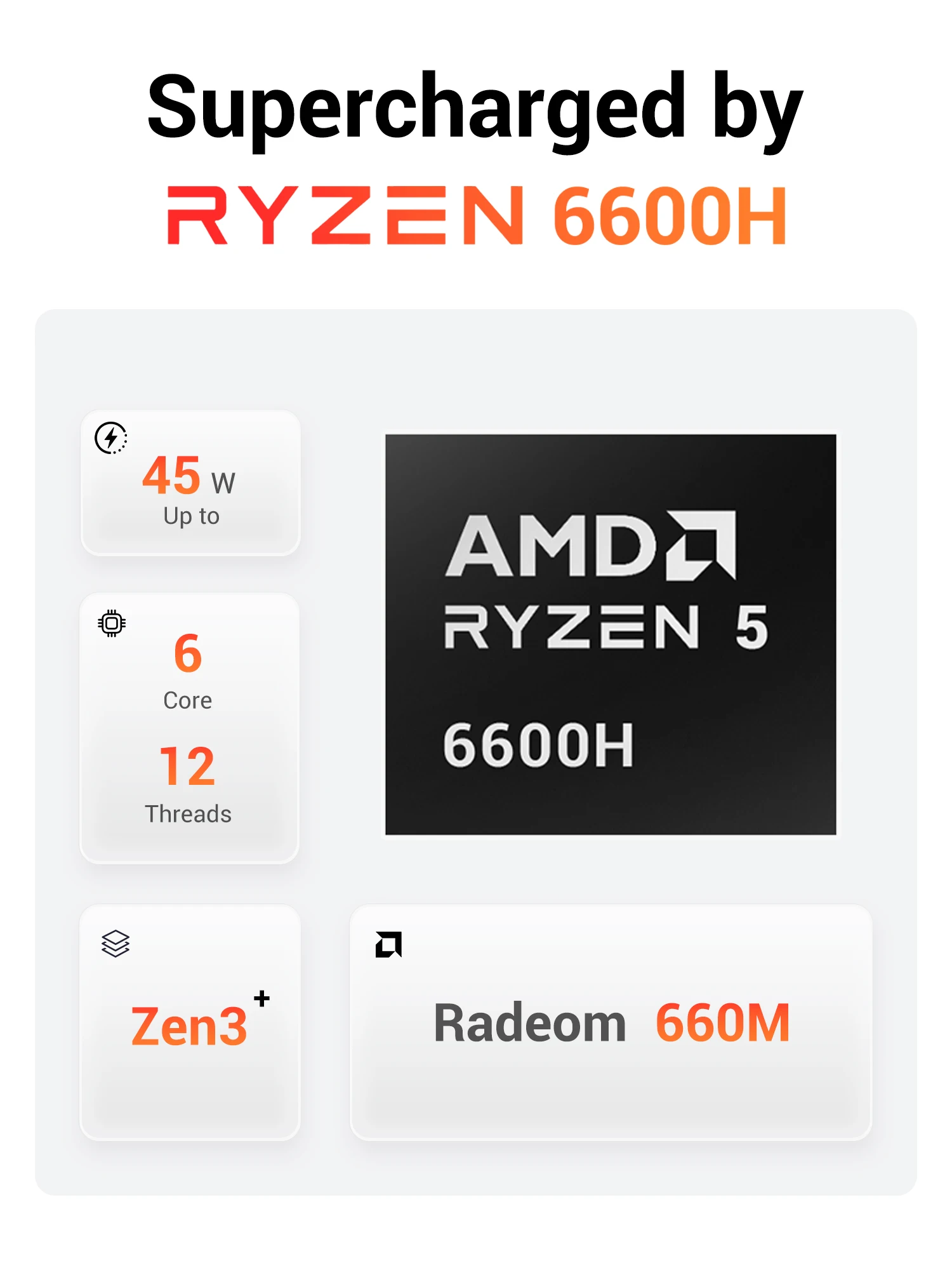 --Firebat AM02 mini pc equips with 6-core/12-thread AMD Ryzen 5 6600H, thanks to the significant improvements of the Zen 3 architecture, the 6600H delivers substantial gains in both office smoothness and productivity performance.