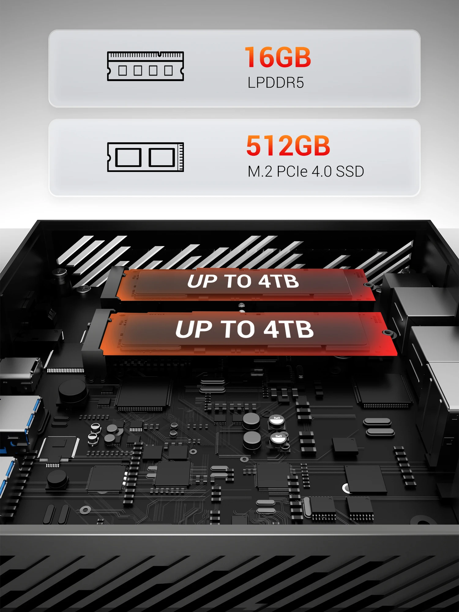 --Pre-installed with 16GB of high-capacity LPDDR5 memory, delivering higher frequencies and smoother multitasking performance. 512GB of massive storage space meets all your daily storage needs. Equipped with dual M.2 SSD slots, supporting future storage expansion up to 8TB.