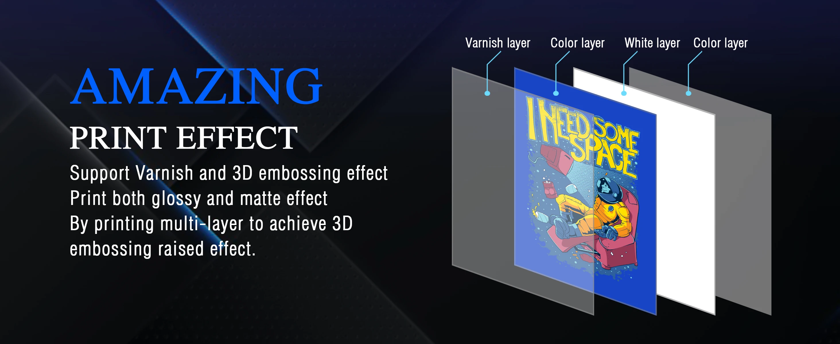 Support Varnish and 3D embossing effect Print both glossy and matte effect By printing multi-layer to achieve 3D embossing raised effect.