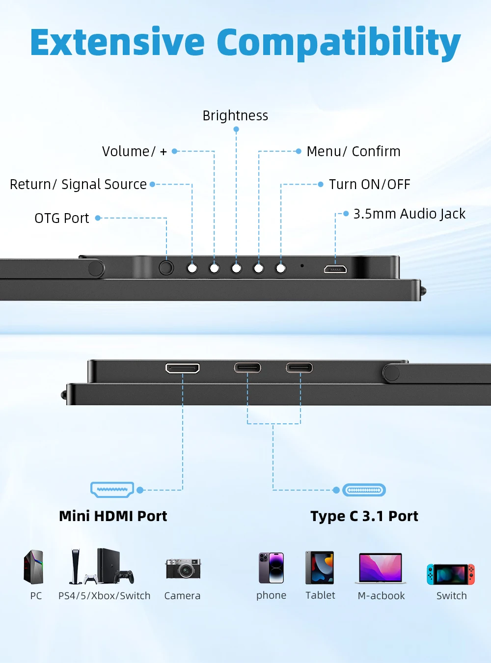 This portable screen features 2 full-functional USB-C ports and 1 mini HDMI ports,making it compatible with a wide range of devices including laptops, desktops, MacBooks, tablets, phones and gaming consoles like PS5, PS4, Xbox,Switch.