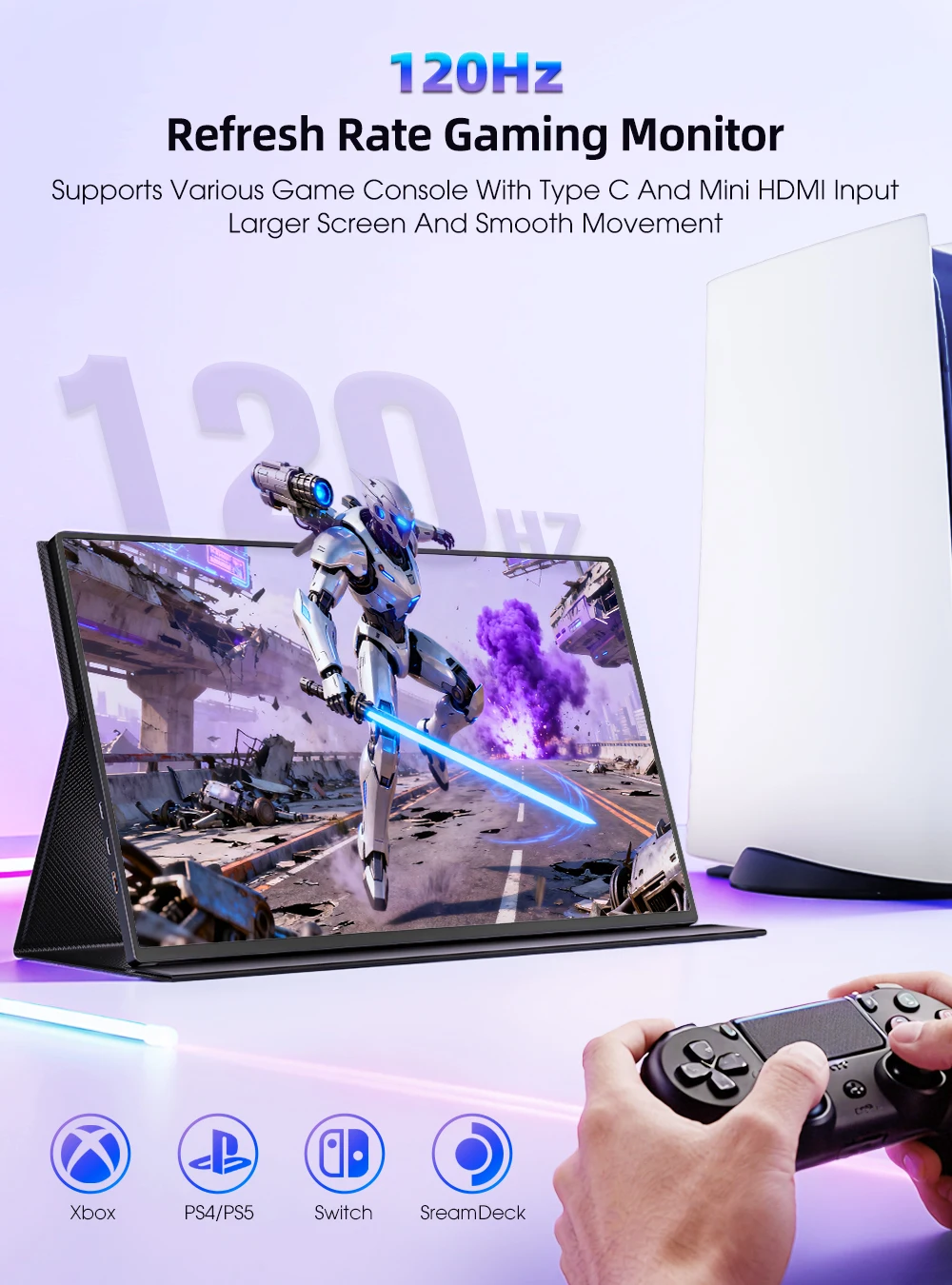 120hz gaming monitor equipped with abundant interfaces mini HDMI & Type C, not only for various PlayStations, but also for other daily devices, such as Switches, Smartphones and Laptops, all of which can be plug-and-play, which is very convenient. Affordable IPS gaming monitor not only maximize entertainment, but also enhance quality of life and productivity.