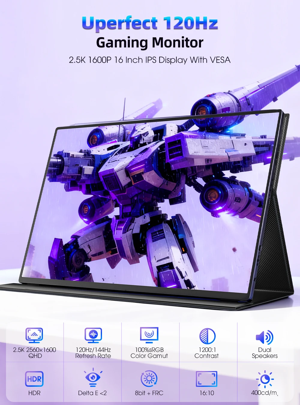 UPERFECT QLED 16" 2.5K Poratable Monitor w/ Type C 144Hz HDMI 120Hz XBOX Switch PS5 Gaming Display Laptop PC Phone Second Screen