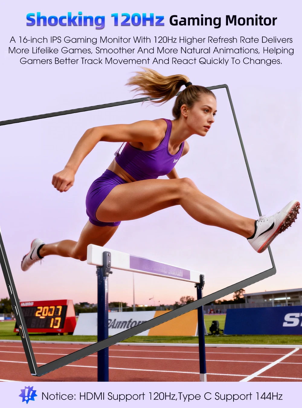 With a 120hz higher refresh rate, 16-inch IPS gaming monitor makes games appear more lifelike, and animations are more fluid and natural. 120 hertz monitor allows gamers to better track movement and react quickly to changing situations, improving the visual quality and performance of games, and providing gamers with a more immersive and enjoyable experience.