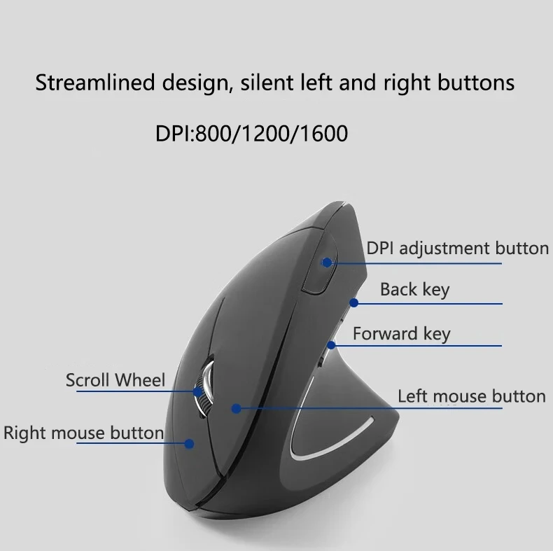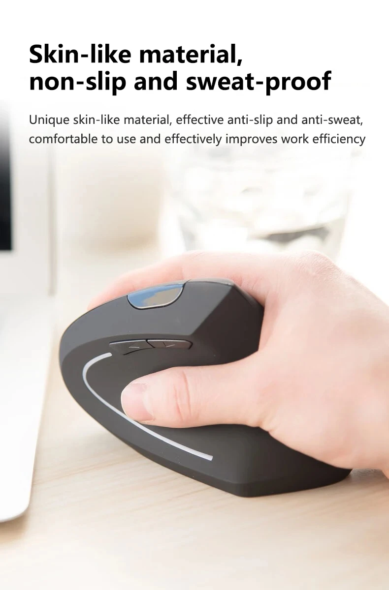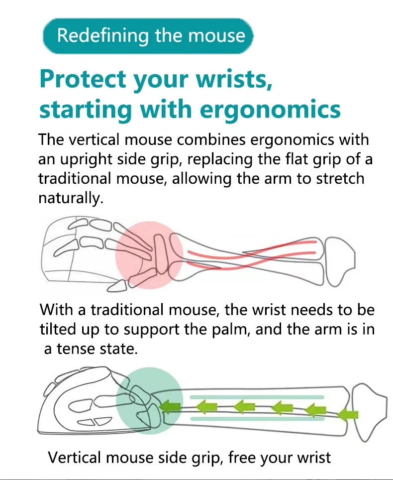 1.Ergonomic design:The vertical mouse keeps your wrist in a natural grip, which reduces wrist wear and tear, relieves wrist fatigue, allows you to maintain a relaxed and comfortable arm posture, and improves office efficiency